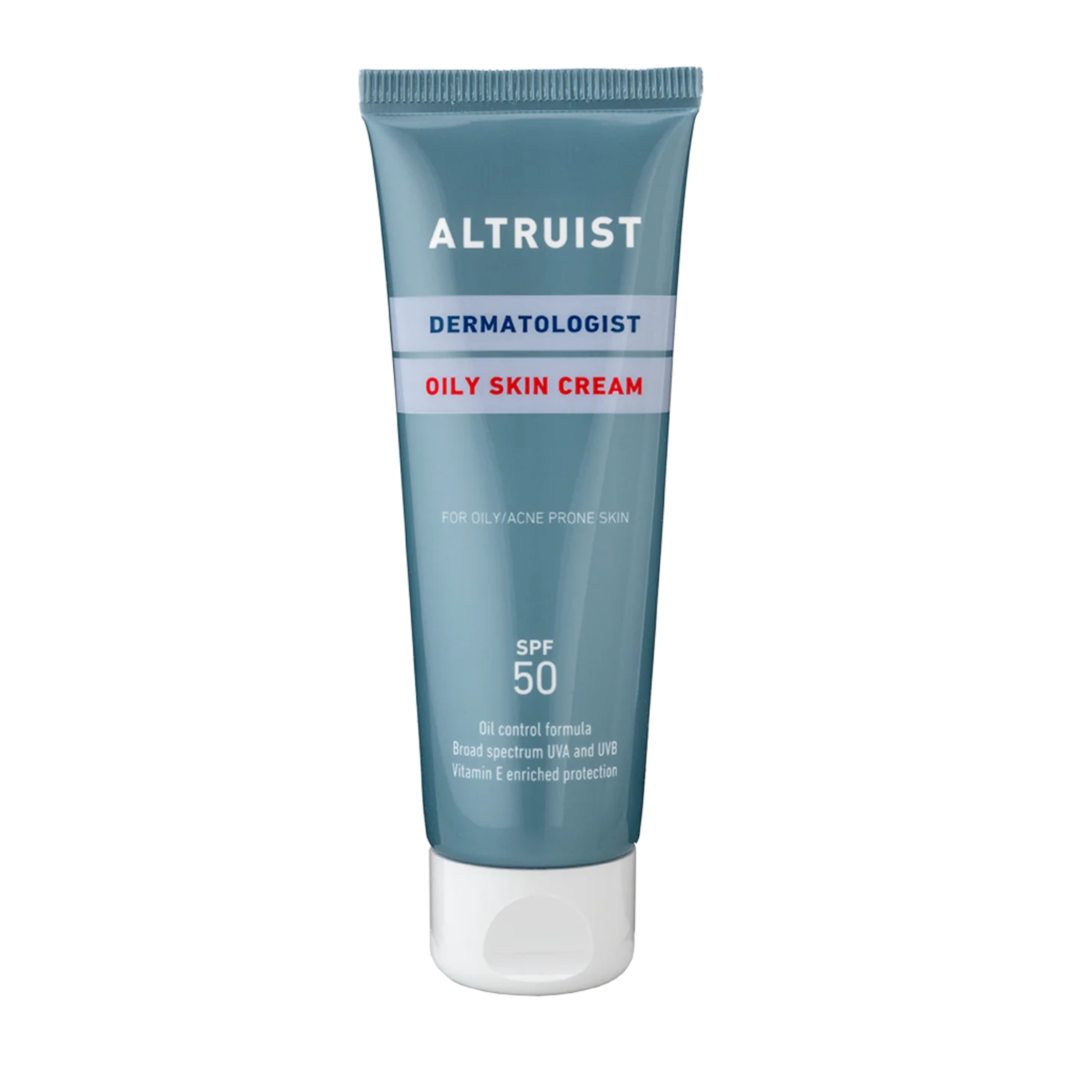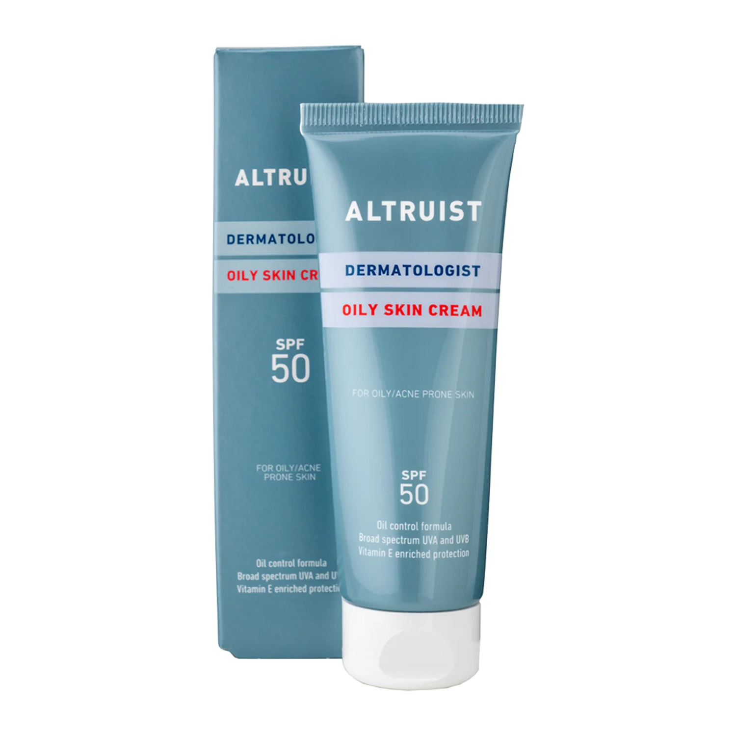 Altruist - Oily Skin Cream SPF50 - hypoalergénny krém určený pre starostlivosť o všetky typy pleti, s osobitným dôrazom na mastnú a aknóznu pleť. Obsiahnuté opaľovacie filtre účinne chránia pleť pred škodlivými účinkami UVA a UVB žiarenia. Okrem toho je jeho zloženie obohatené o silný antioxidant tokoferylacetát, ktorý neutralizuje voľné radikály, podporuje ochranu pred oxidačným stresom a predčasným starnutím pokožky. Okrem toho zmatňujúca látka na báze škrobu, ktorá je vo výrobku prítomná, zabraňuje nadmernému lesku pleti, takže krém je ideálny aj ako podklad pod make-up. Kozmetika je uložená v praktickej tube, ktorá zaručuje pohodlné a hygienické dávkovanie, a jej kompaktný tvar je ideálny na cestovanie a každodennú starostlivosť. Výrobok neobsahuje parabény ani parfumáciu a je vhodný aj pre vegánov.