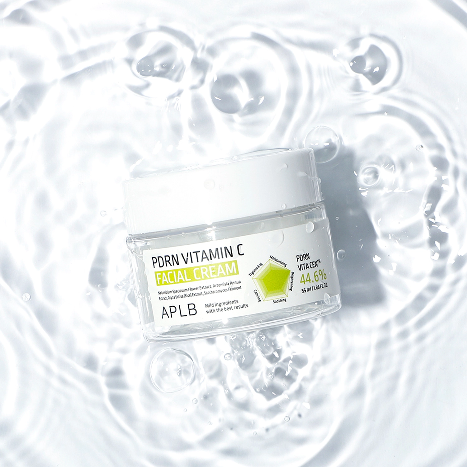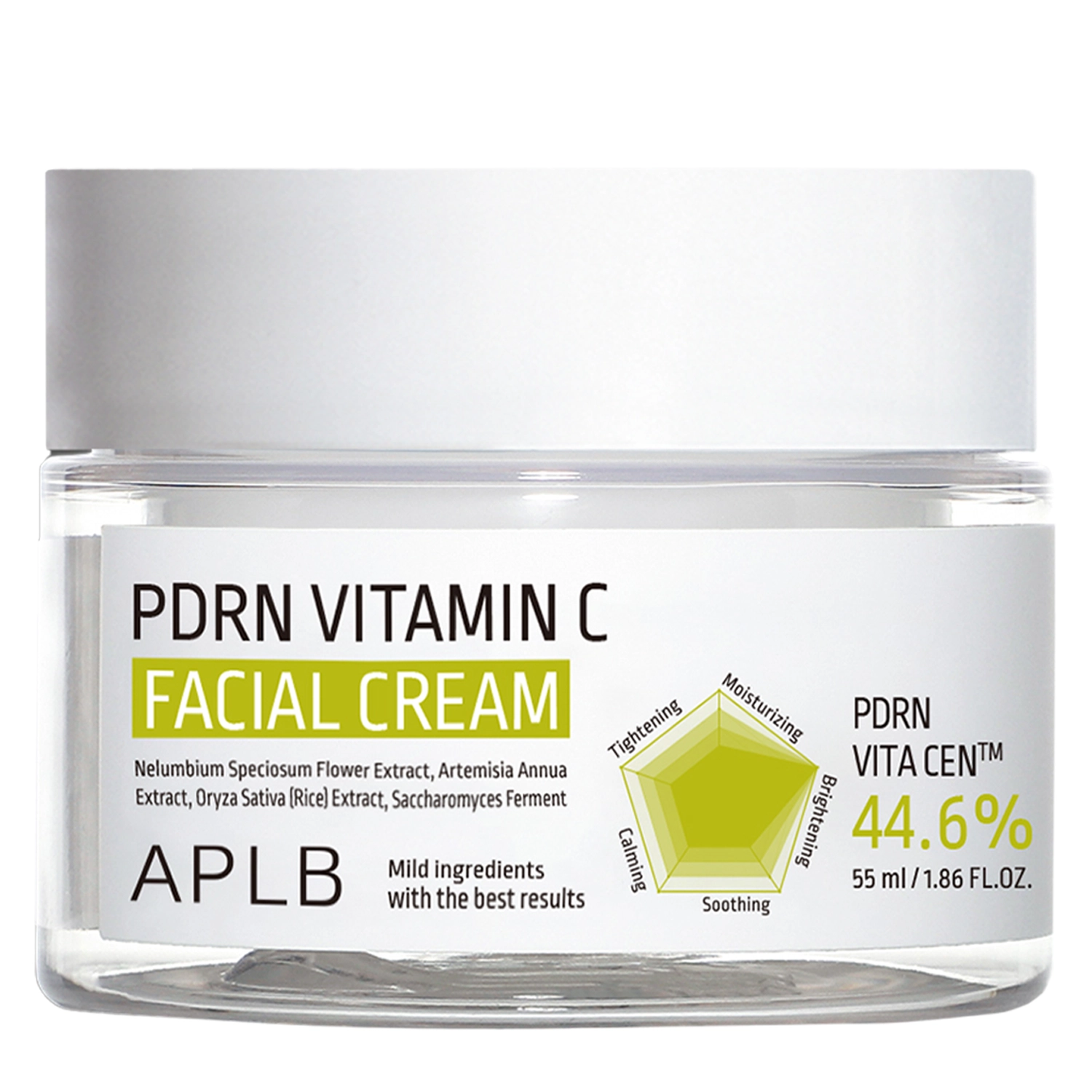 APLB - PDRN Vitamin C Facial Cream - spevňujúci a antioxidačný krém na tvár s vitamínom C. Jeho základom je komplex PDRN VITA CEN™ od APLB s koncentráciou 44,6 %. Komplex obsahuje upokojujúci podráždenia a hydratačný extrakt z pupočníka ázijského, antioxidant a vyrovnávajúci tón pleti vitamín C vo forme kyseliny askorbovej a PDRN, regeneračnú a protivráskovú zložku. Pochádza z lososieho mlieka a má silné vlastnosti regeneračné, stimuluje obnovu buniek, spevňuje a pôsobí protizápalovo. Krém má ľahké zloženie bez parfumácie, vďaka čomu je vhodný pre všetky typy pleti, vrátane citlivej pleti.