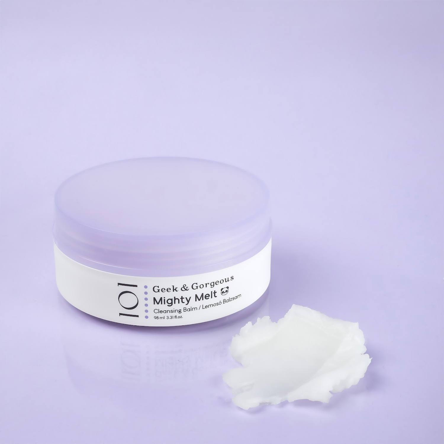 Geek & Gorgeous - Mighty Melt - čistiaci balzam, ktorý rozpúšťa make-up, odstraňuje nečistoty, zvyšky opaľovacieho krému, či inej kozmetiyk starostlivosti o pleť. Ľahko si poradí aj s vodoodolným make-upom. Zloženie balzamu sa pod vplyvom tepla mení na hodvábny olej. Pri kontakte s vodou emulguje, vďaka čomu sa jednoducho zmýva z pokožky vo forme mliečnej emulzie. Zloženie bolo vytvorené z ingrediencií, ktoré hĺbkovo čistia a zmäkčujú pokožku, medzi inými: Ethylhexyl Palmitate, PEG-20 Glyceryl Triisostearate a oleyl erucinate. Kozmetický prípravok je vegánsky a bezpečný pre tehotné ženy.