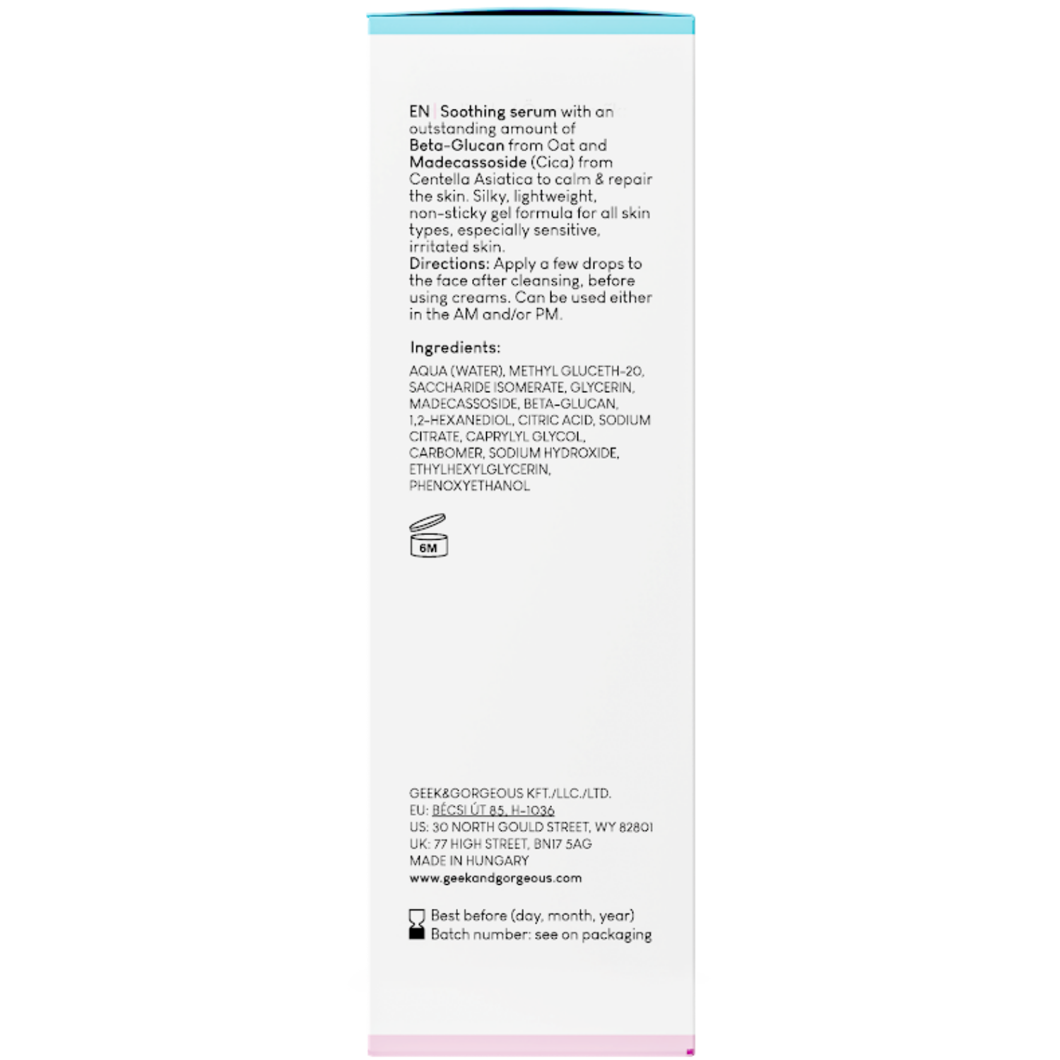 Geek & Gorgeous - Stress Less Beta Glukan + Madecassoside - 0.5% - gélové sérum s beta-glukánom a madecassozidom je ideálny prípravok na obnovu hydrolipidovej bariéry pokožky. Beta-glukán pôsobí silne vyživujúco a regeneračne, hydratuje pokožku do hĺbky a zároveň vytvára na jej povrchu ochrannú vrstvu, ktorá zabraňuje dehydratácii. Madecassozid z pupočníka ázijského má silné regeneračné, upokojujúce a protizápalové účinky. Navyše reguluje tvorbu melanínu a pôsobí antioxidačne. Kozmetika je vegánska.