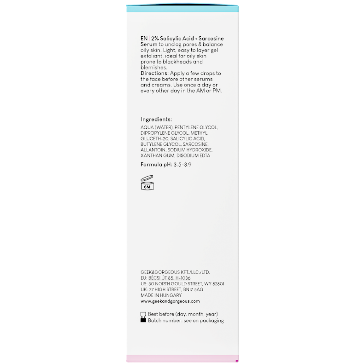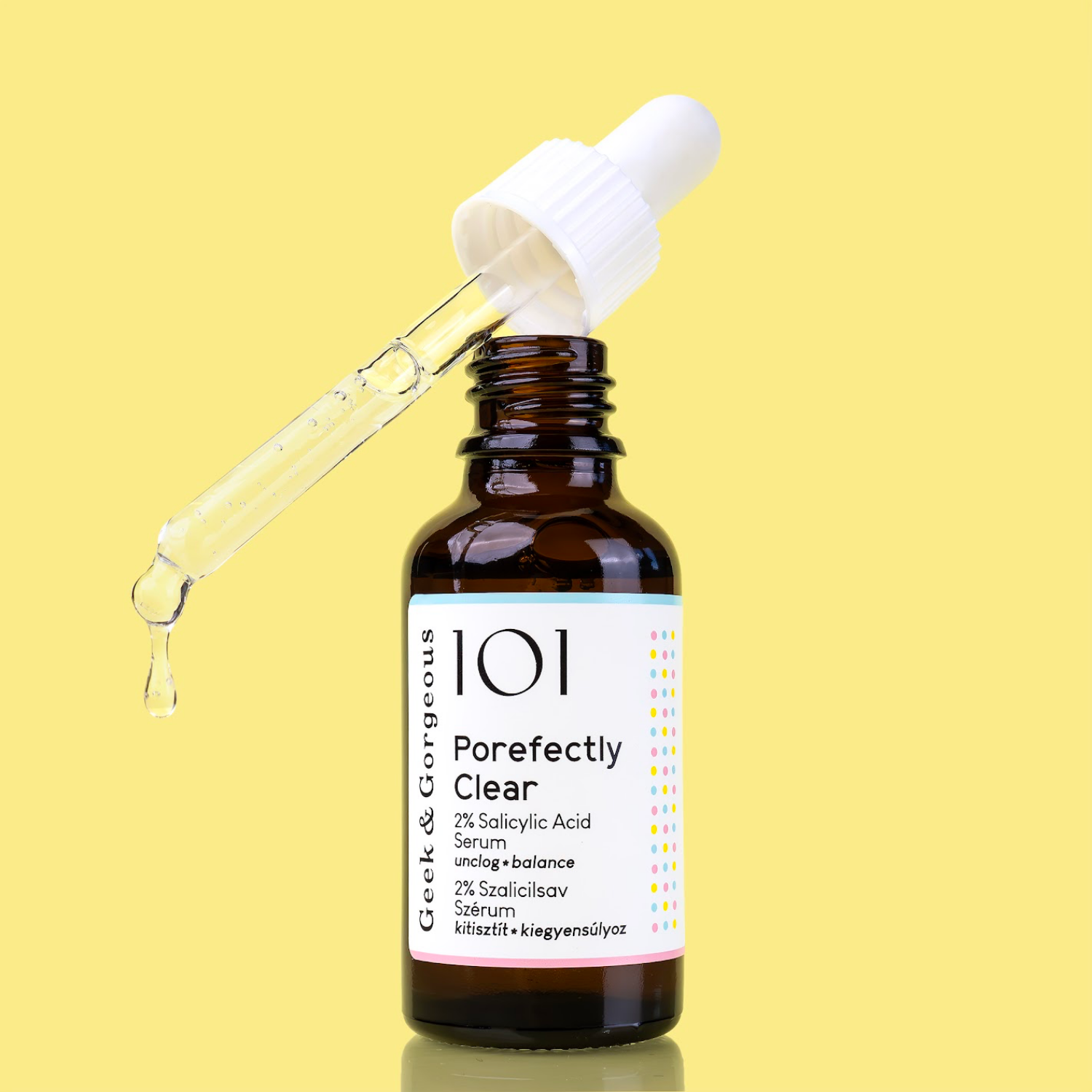 Geek & Gorgeous - Porefectly Clear - sérum s ľahkou, gélovou konzistenciou. Obsahuje 2% kyselinu salicylovú s protizápalovým účinkom a čistiacim účinkom na vývody mazových žliaz. Pomáha v boji s nedokonalosťami pleti. Okrem toho sarkozín obsiahnutý v zložení, reguluje vylučovanie kožného mazu a navyše pôsobí proti vráskam. Alantoín má upokojujúce vlastnosti a minimalizuje podráždenia. Kozmetika má pH v rozmedzí 3,5 až 3,9 a jej zloženie je vegánske.