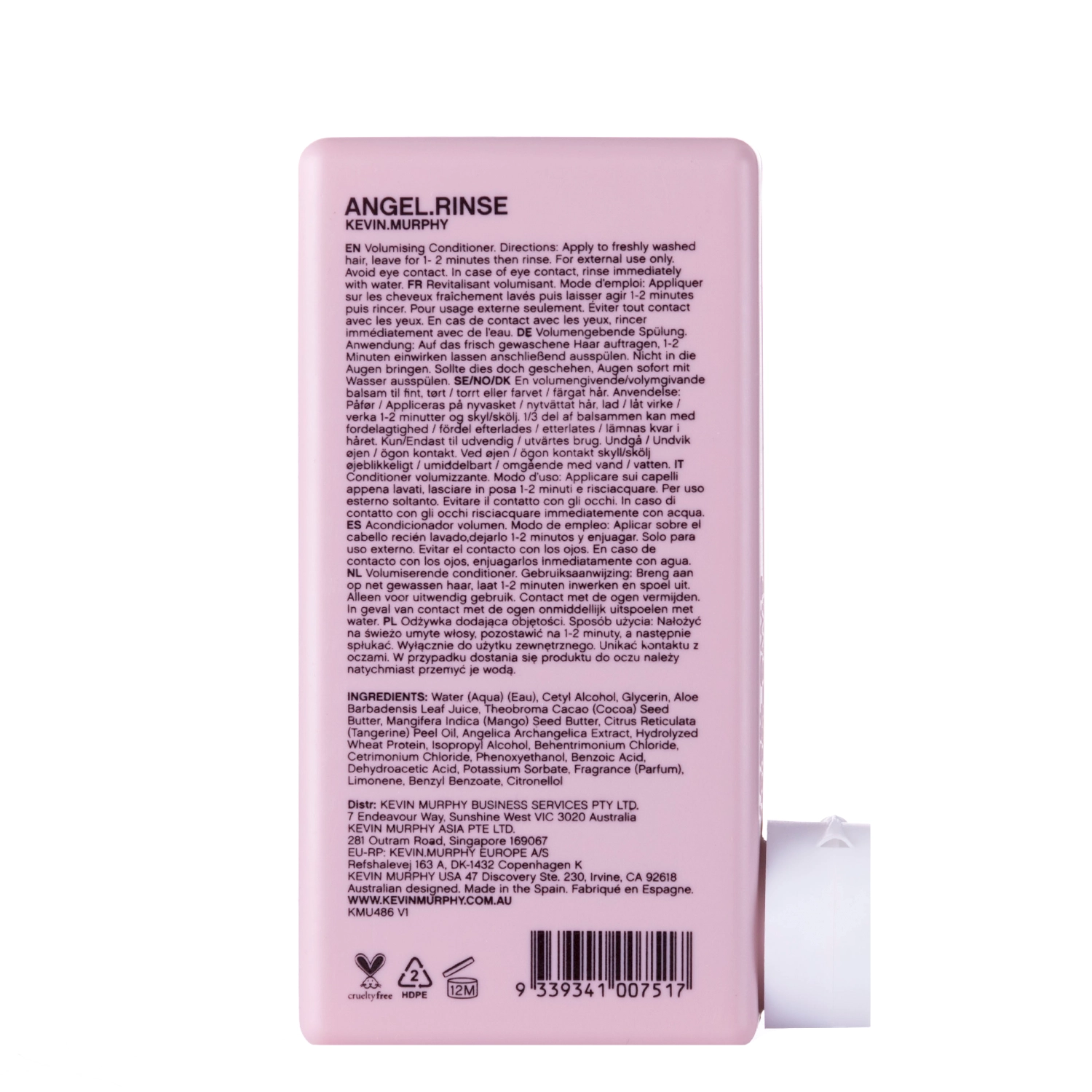 Kevin Murphy - Angel Rinse - kondicionér dodáva objem a posilňuje vlasy zničené farbením a stylingom. Obsahuje mangové maslo, ktoré zlepšuje pružnosť vlasov, kakaové maslo, ktoré chráni pred stratou vlhkosti a pred účinkami vonkajších vplyvov, šťavu z aloe vera, ktorá hydratuje vlasy a upokojuje podráždenú pokožku hlavy a hydrolyzát pšeničného proteínu, ktorý regeneruje a minimalizuje elektrizovanie vlasov. Kondicionér dodáva vlasom objem a zanecháva ich mäkké.