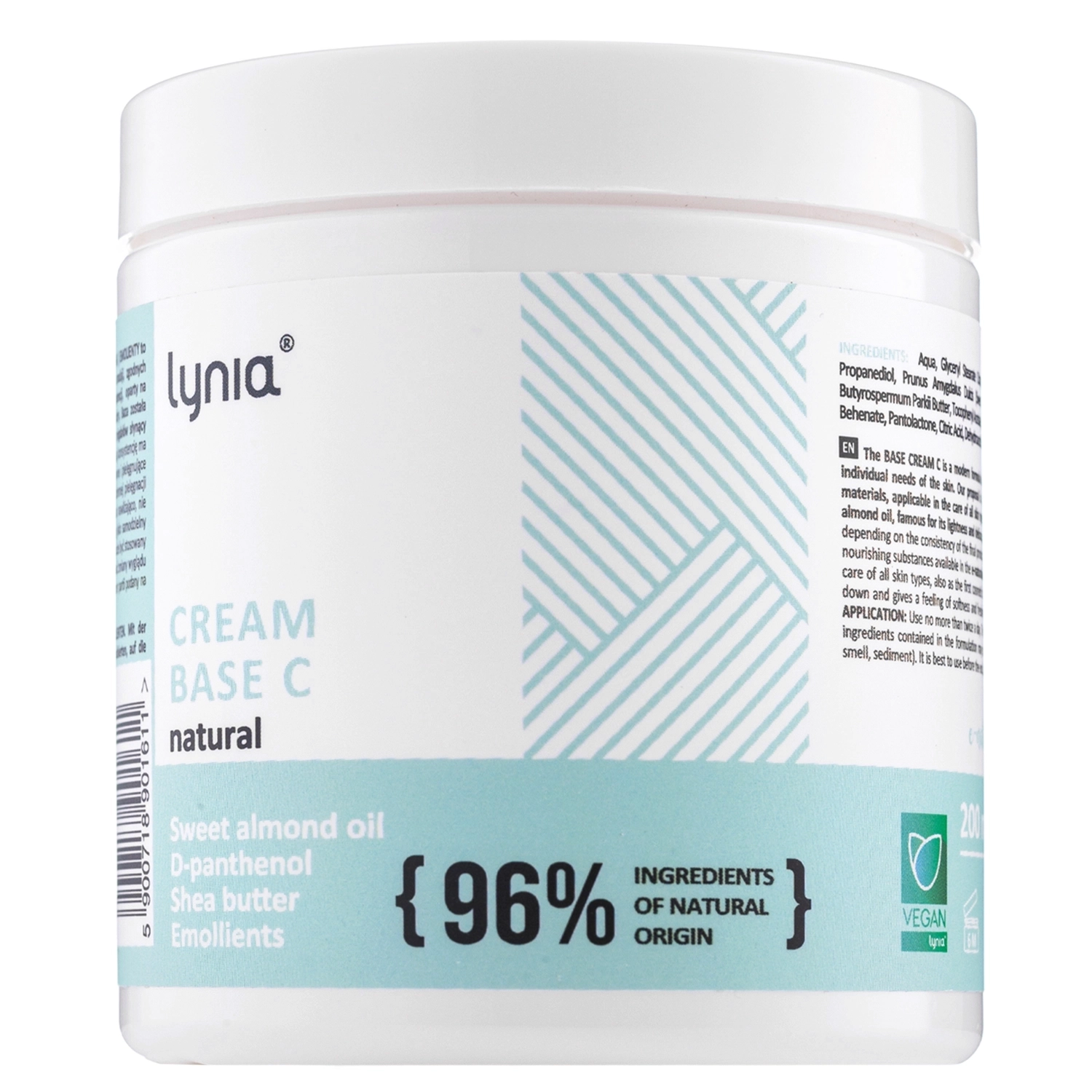 Lynia - Cream Base C Natural - Ľahký hydratačný krém/báza s vitamínmi B5 a E - ľahký krém na báze prírodných zložiek, vhodný pre všetky typy pleti. Prípravok obsahuje panthenol a vitamín E a bol ďalej obohatený o olej zo sladkých mandlí, ktorý je známy pre svoje jemné a ľahké zloženie. Krém/báza hydratuje, nezaťažuje pleť a zanecháva ju sviežu a hebkú na dotyk. Možno používať aj samostatne.