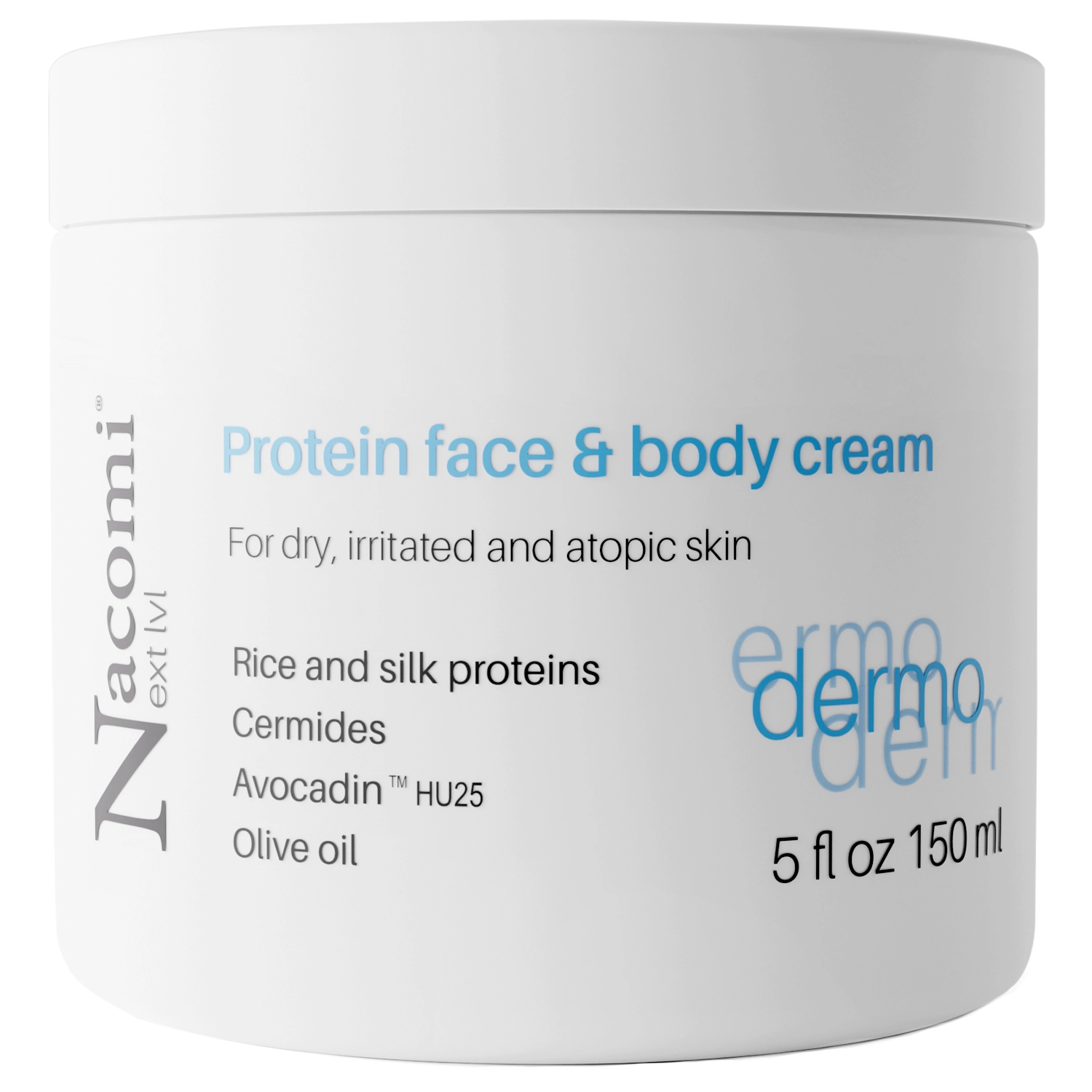 Nacomi - Dermo - Protein Face & Body Cream - ošetrujúci krém pre veľmi citlivú, atopickú a suchú pokožku tváre a tela. Obsahuje jemný olivový olej a bambucké maslo, ktoré premasťujú a chránia pred stratou vody, ceramidy a hydrolyzované proteíny, ktoré obnovujú narušenú hydrolipidovú bariéru, čím dlhodobo a účinne hydratujú a niacínamid, alantoín a vitamín E, ktoré upokojujú a upokojujú. Prírodný produkt.