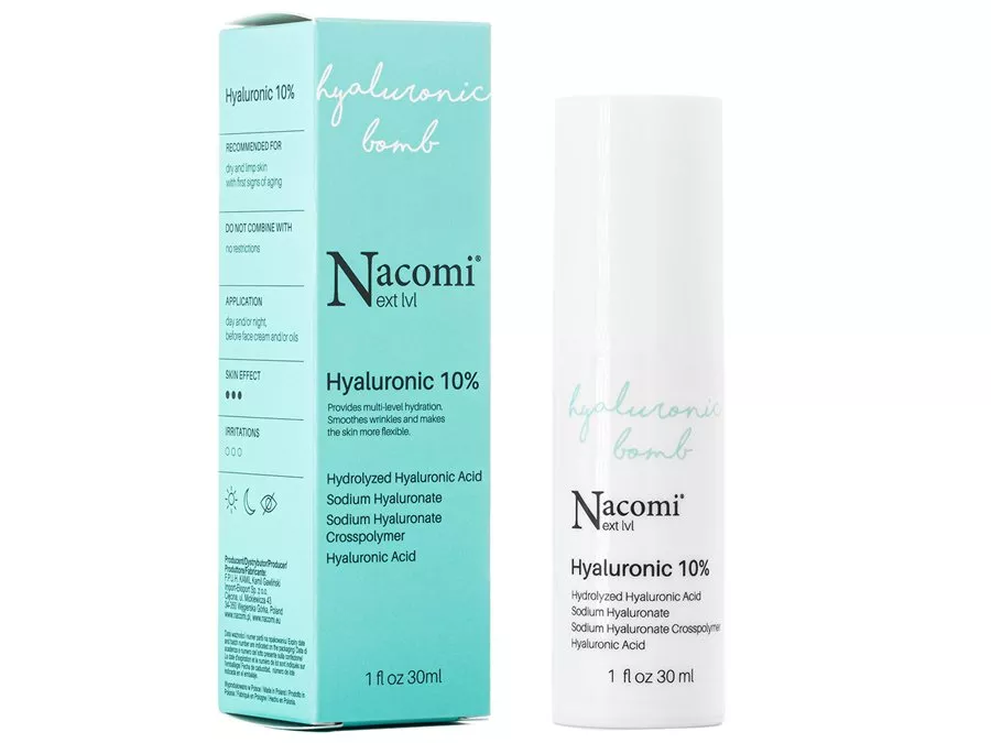 Nacomi - Next Level - Hyaluronic 10% - obsahuje 4 formy kyseliny hyalurónovej, ktorá viaže vodu v pokožke a zaisťuje dostatočnú úroveň hydratácie a Hydrolyzed Glycosaminoglycans, ktoré zmäkčujú, vyhladzujú a zabraňujú strate vody z pokožky. Prípravok bol ďalej obohatený o hydrolyzovaný extrakt z kvasníc, ktorý hydratuje, vyhladzuje a zmäkčuje.