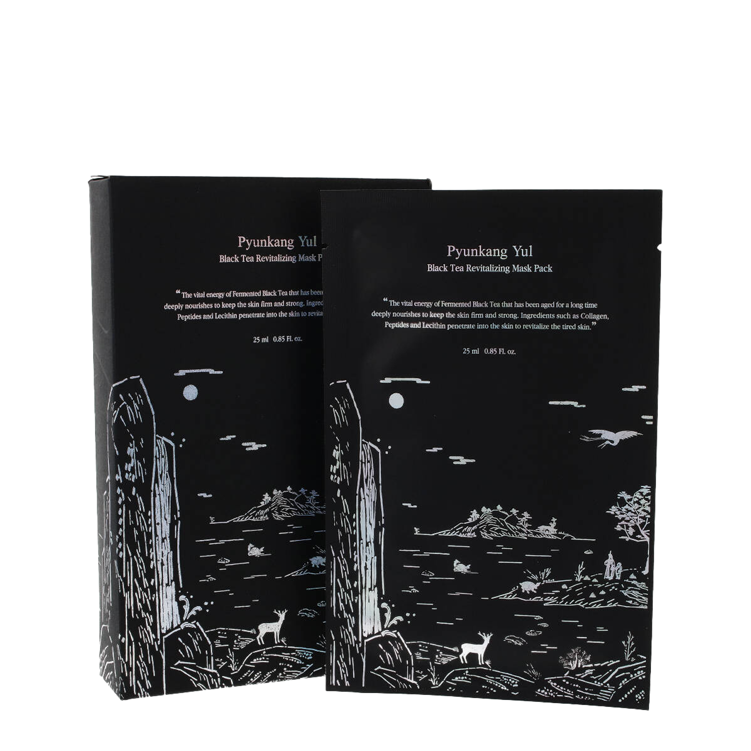 Pyunkang Yul - Black Tea Revitalizing Mask Pack - regeneračná textilná maska na tvár. Obsahuje niacínamid, ktorý upokojuje podráždenie, reguluje prácu mazových žliaz a zjednocuje tón pleti, extrakt z listov čaju a extrakt z brusnice úzkolistej, ktoré majú antioxidačné účinky, vytvárajú ochrannú bariéru proti voľným radikálom a spomaľujú proces starnutia a peptidy v kombinácii s kolagénom a 5 formami kyseliny hyalurónovej spevňujú, napínajú a hydratujú. Prípravok bol ďalej obohatený o skvalán a Ceramide NP, ktoré upokojujú a posilňujú pleť. Maska zanecháva pleť intenzívne vyživenú a hydratovanú.