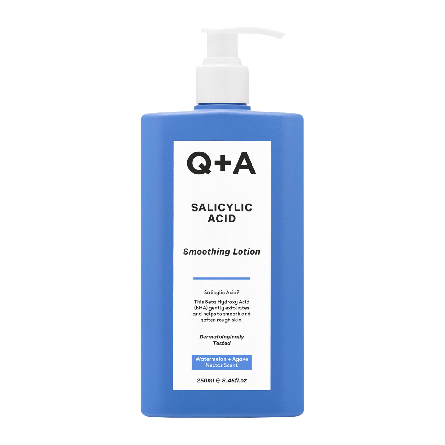 Q+A - Salicylic Acid Smoothing Lotion - telový balzam s vyhladzujúcim účinkom pre všetky typy pokožky. Obsahuje kyselinu salicylovú, ktorá redukuje nedokonalosti a čierne bodky, znižuje sekréciu kožného mazu a jemne exfoliuje, ovsený prášok, ktorý hydratuje, upokojuje a vyhladzuje a extrakt z kôry bielej vŕby, ktorý reguluje sekréciu kožného mazu, čistí upchaté póry a znižuje zápaly.
