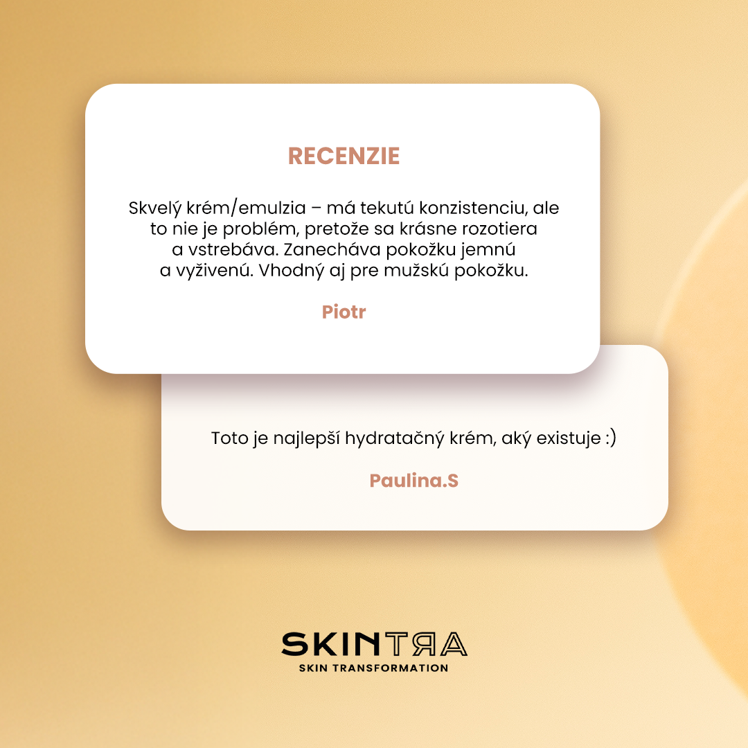 SkinTra - Let Your Skin Feed On - ľahký výživný krém s multifunkčným ošetrujúcim účinkom. Krém dostatočne hydratuje bez toho, aby zanechával mastný film. Obsahuje zložky NMF (prírodný zvlhčujúci faktor) a tiež prebiotiká a fermenty, ktoré obnovujú prirodzený mikróbiom pleti a fyziologickým a aktívnym spôsobom pokožku hĺbkovo hydratujú a regenerujú. Obsiahnuté zložky dopĺňajú potrebné látky, ktorých nedostatok by spôsoboval dlhodobú či dočasnú suchosť pokožky, obnovujú dostatočnú úroveň hydratácie a zabraňujú opakovanému vysychaniu. Antioxidačné a protizápalové účinné zložky urýchľujú regeneračné procesy. Zloženie prípravku má nízky komedogénny stupeň a má intenzívne vyživujúce vlastnosti. Účinky prípravku sú dlhotrvajúce a pocítite ich už po niekoľkých aplikáciách.