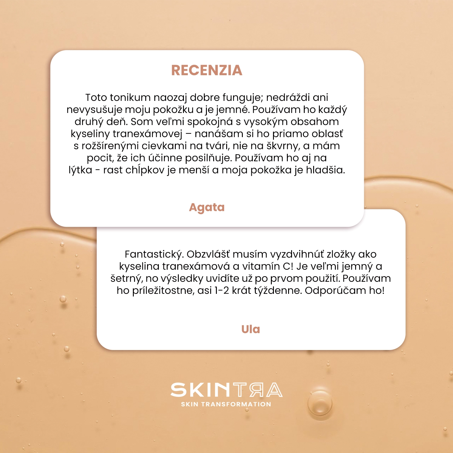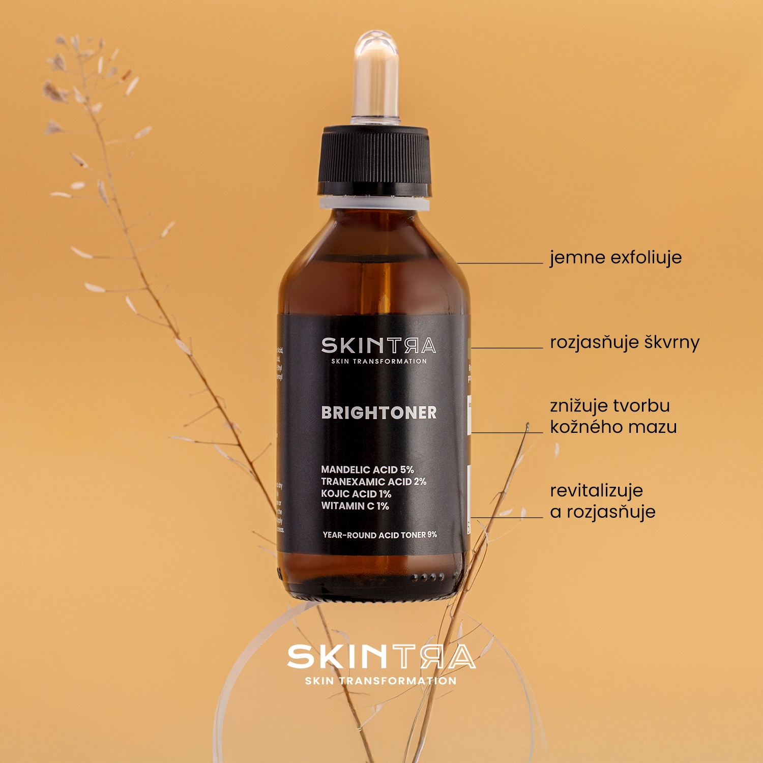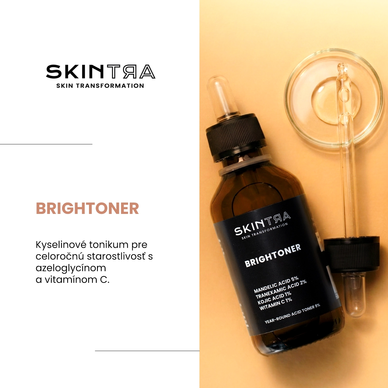 SkinTra - Brightoner - kyselinové tonikum vhodné na celoročnú starostlivosť o pleť. Obsahuje: kyselinu mandľovú, kyselinu dojkovú, kyselinu tranexamovú, azeloglycín a vitamín C, ktoré účinne exfoliujú, vyhladzujú a rozjasňujú pokožku a vďaka vlastnostiam inhibujúcim aktivitu enzýmu tyrozinázy znižujú syntézu melanínu, čím zabraňujú vzniku pigmentových škvŕn. Tonikum rozpúšťa medzibunkové väzby medzi zrohovatenými šupinkami a tým napomáha ich odstráneniu a postupne tiež zosvetľuje vzniknuté zafarbenia. Ideálny pre pleť matnú, šedú bez lesku, zanesenú, s pigmentovými škvrnami a problematickú so sklonom k akné a vzniku čiernych bodiek. Prípravok nie je fototoxický a nespôsobuje fotosenzitizujúce reakcie, možno ho preto použiť bez ohľadu na ročné obdobie. Hodnota pH výrobku sa pohybuje okolo 3,8. Vegánsky produkt.